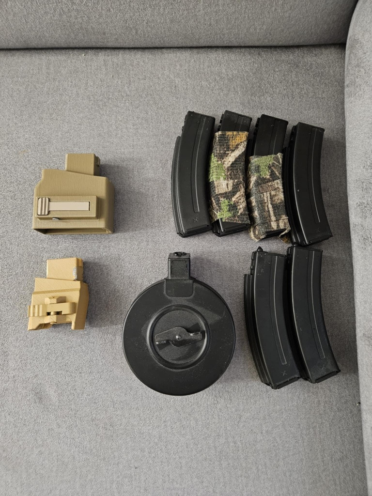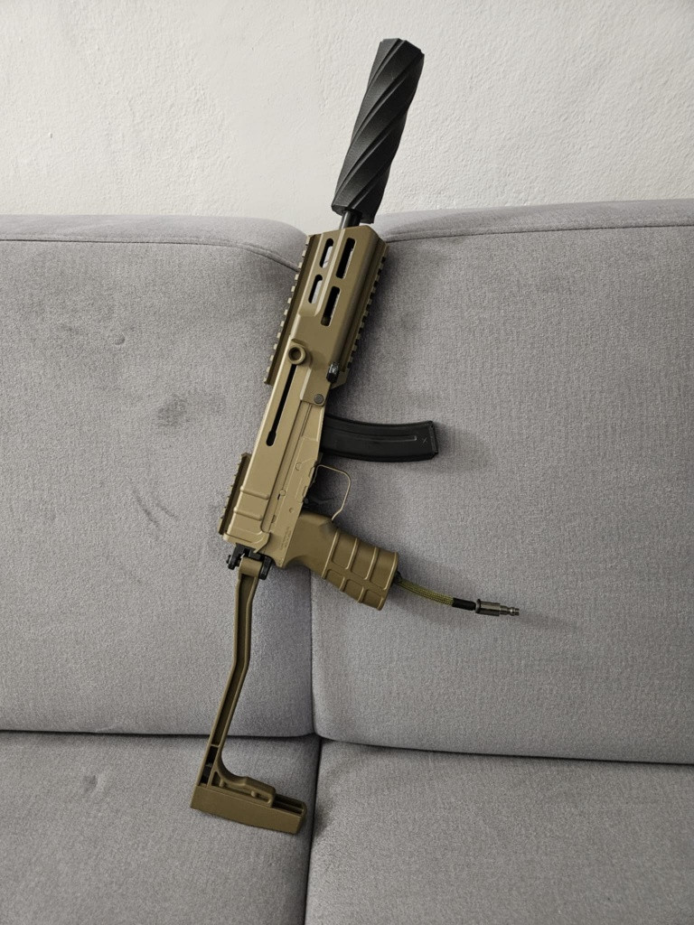 Máš rád český zbraně, ale jsi tak trochu prase? To jsi tady správně. Tohle je vz. 61 ala Mod D od Tokio Maruy. Běžná verze je AEP, toto je komplet HPA přestavba s custom HPA komorou a uchycením enginu od Scraba (YT: Scrab VZ 61 HPA) a HPA systému pro MP7 předělaného od Airsoftjunkiez. -Uvnitř Polarstar Jack MP7 kit upravený od Airsoftjunkiez - 550 USD -TDC Hop Komora a casing pro engine Scrab - cca 150€ AEP -NIneBall hlavě a AEP guma - Dalo by se vyměnit za PDI a rhop. - 6 TM VZ 61 zásobníků, jeden buben + 2 tištěné korverze jedna na MP5 zásobníky a druhá na M4 zásobníky. Se zbraní se dá vyhrát co se týče doplňků, je hodně věcí i k 3D tisku (fotka s jinou pažbou, adaptérem apod). Výkonově od XY J až po 1.3J - ideální na CQB nebo hřiště kde je limit na fullauto 1.3J. Po výměně za PDI hlaveň nebo delší hlaveň poroste výkon nahoru.