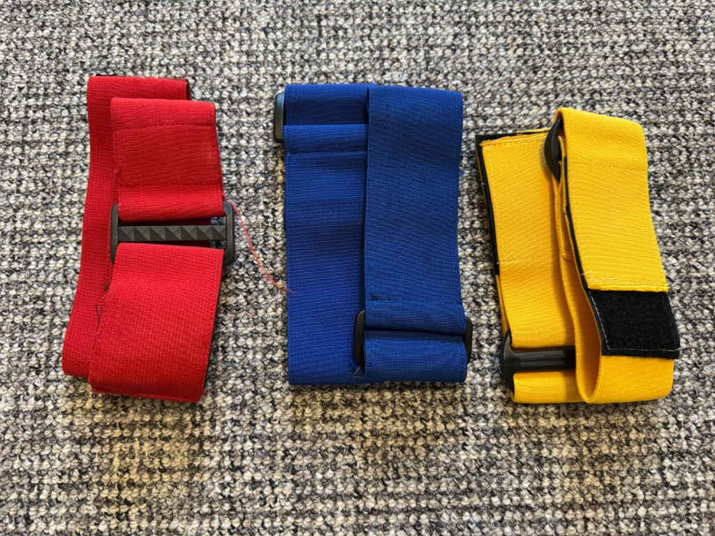 Rozlišovací popruhy na ruce z pruženky, nastavitelné, na sucháč, 2x červená, 2x žlutá, 2x modrá. Dále flaška s kulema 0,28g od GG 5000ks, asi třetina je pryč. Cenu nabídněte.