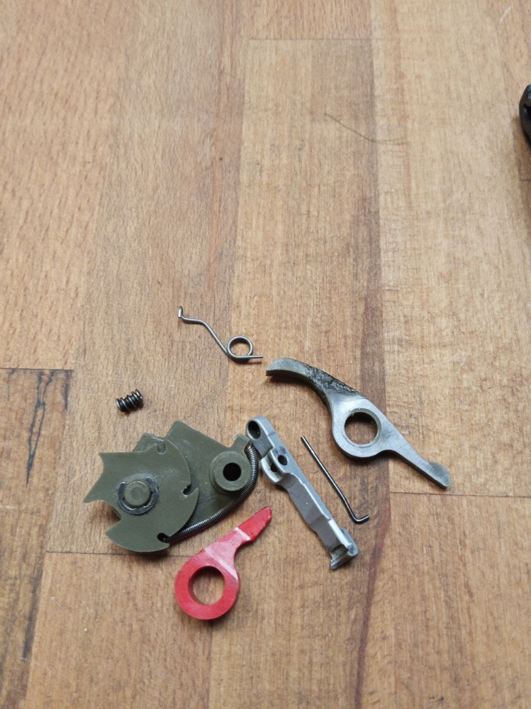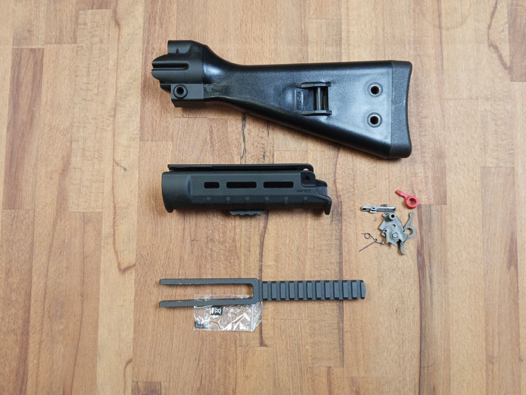 Mix dílů spouště AUG A1 a vytahovač s pružinou 900kč; těžká weaver lišta na AKS-74U 500kč; Předpažbí magpul SL pro MP5 1200, pažba MKE 1000.