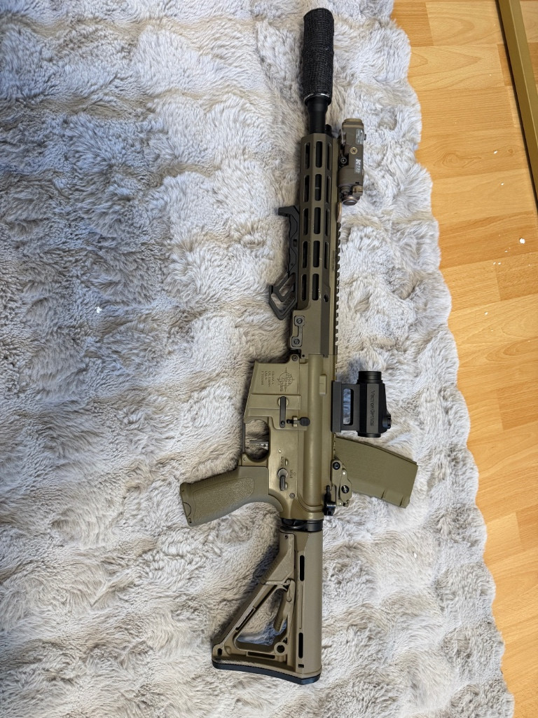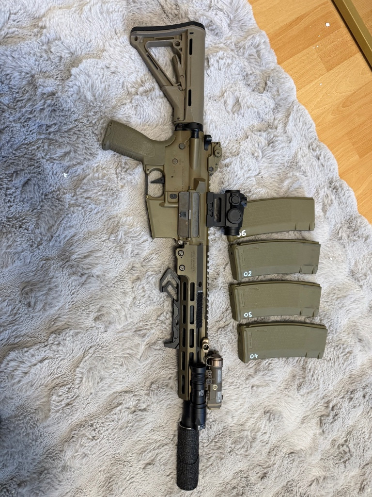 Prodám tuhle URGI stavěnou minulý rok do absolutního topu seznam dílů je ve fotce prodam tak jak je proinvestováno 30k+ výměna za MacBook kdyby náhodou ale spis prodej ;). Kolimator vector 3 generace, ručka blackcat cnc, pažba je kopie magpul Tlumič basic nějaký, svítilna funguje na spínač na svítilně a peq je jen maketa, prodám se 4mi zásobníky, přidám ještě popruh dvoubodový v multicam dále lipolku 11.1 a nabíječku.