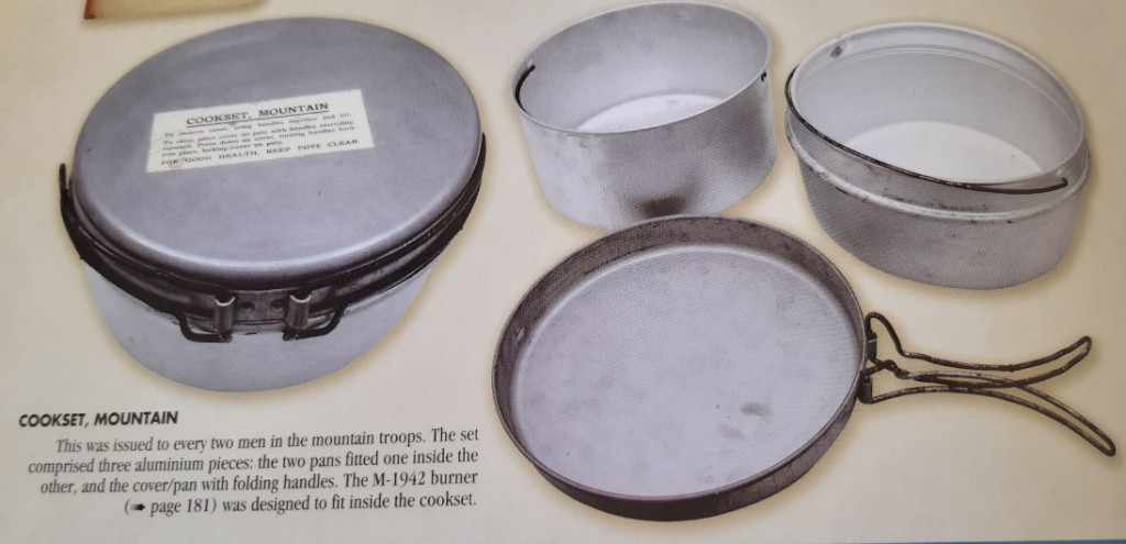 Vybavení pro přípravu jídla horských jednotek US Army - Mountain Set original WW2. Poškozené oba ešusy - koroze. Platí do smazání.