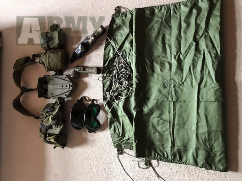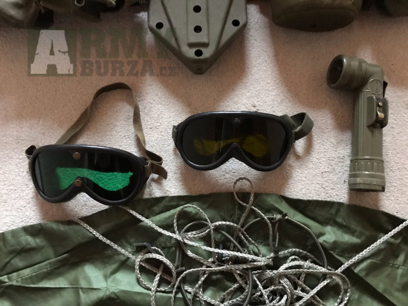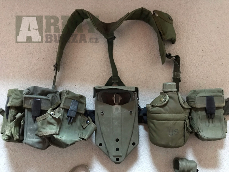 Nabízím originál US army vybaní - opasek, popruhy, lékárna, 4x sumka, čutora 1 litr vč. obalu, skládací lopata vč.obalu, svítilna, 2x brýle, poncho a nůž pro přežití (zn.Fox)