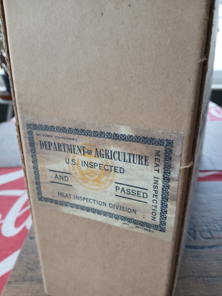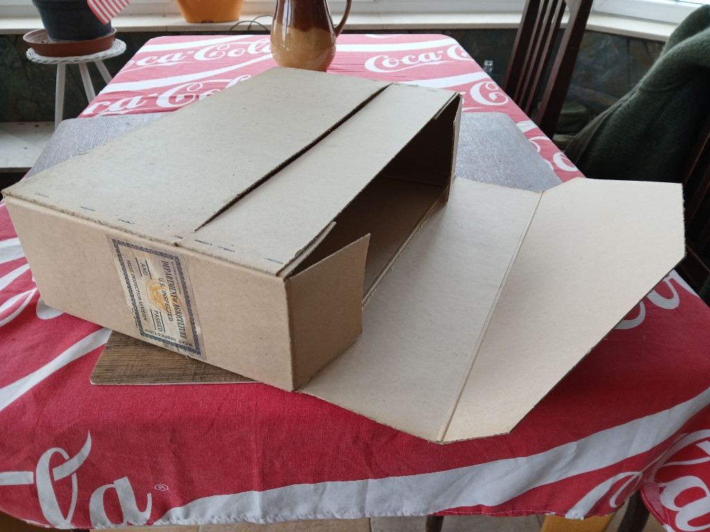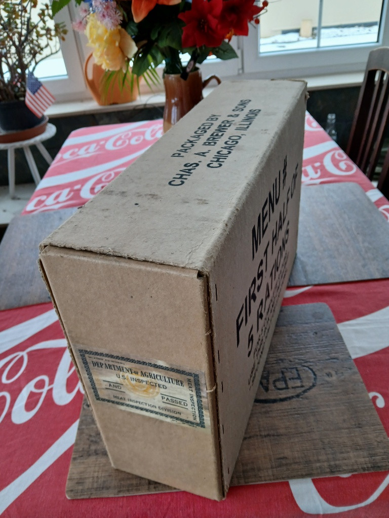 Replika US ww2 ration bedýnky ze staré krabice z tvrdého papíru (jako UNRRA bedýnky), vhodná pro doplnění, dekoraci polní kuchyně, na konzervy, chleba, na vozidlo atd... Rozměr 41x26x11 cm. cena 280,-