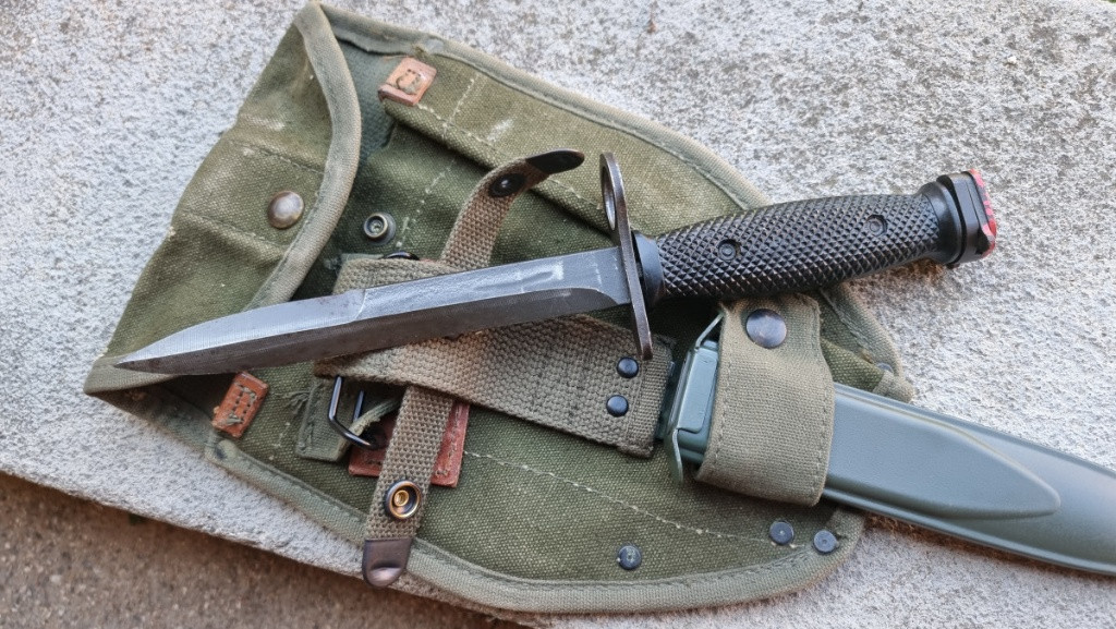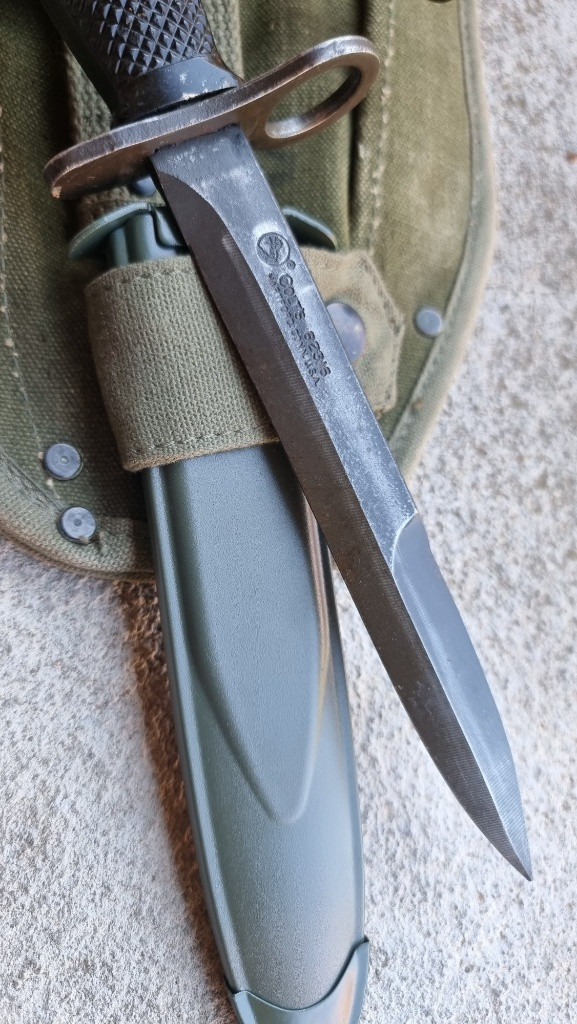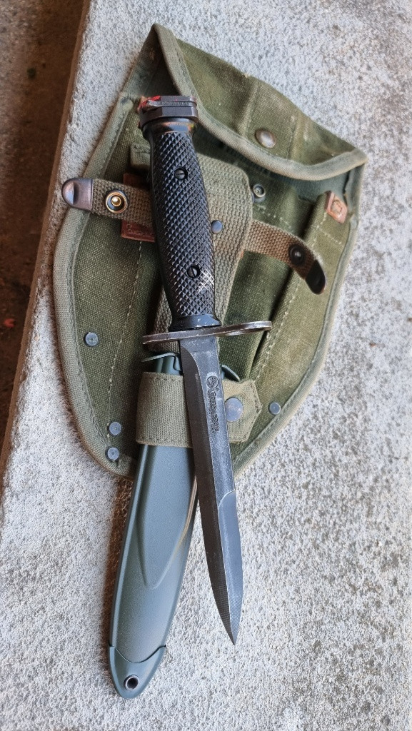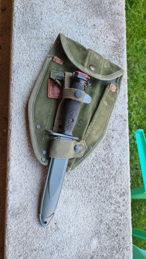 Prodám hezky US bajonet, výroba Amerika COLT. Pouzdro novovýroba plus originál US obal na lopatku z války ve Vietnamu. Cena za komplet. Osobní predani možné v Brně a okolí
