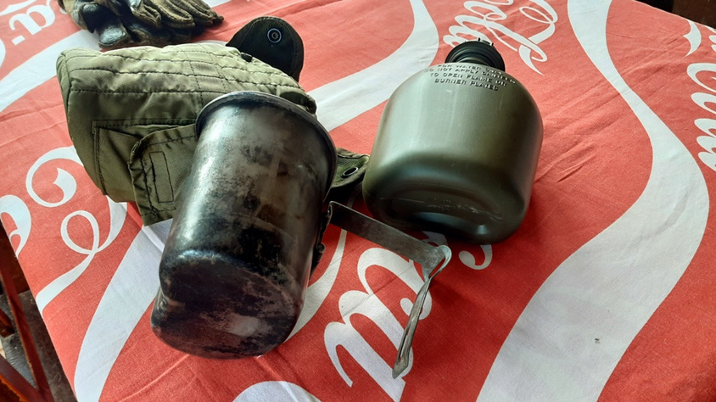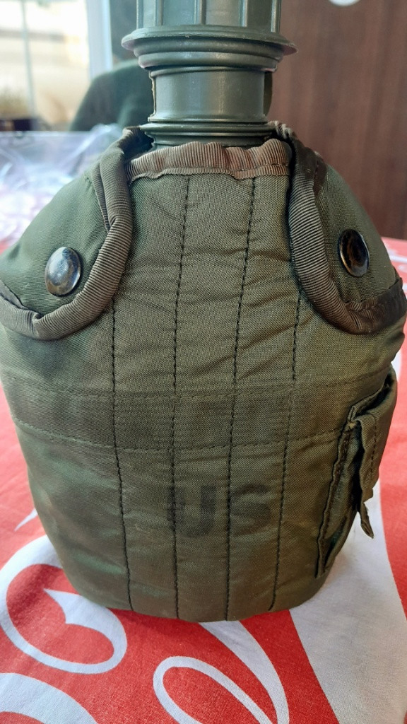Originál US polní láhev s pítkem a obalem v dobrém,nezničenéma a fukčním stavu viz foto. Obal 1967 Pítko 1963 Láhev 1976 Po domluvě je možno i jednotlivě. cena komplet 1800,- Podšití vnitřku obalu je v pořádku, nepotrhané.