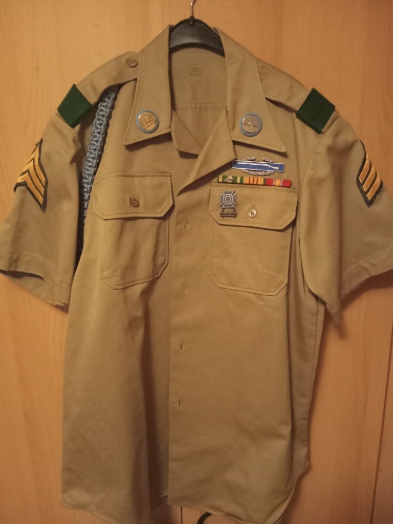 Prodám komplet US letní vycházkovku Blůza: velikost M Obsahuje: pěchotní slavnostní šňůru, 2 modré pěchotní disky s příslušnými odznaky pěchoty, Combat Infantry badge, odznak Sharpshooter s Rifle podvěškem, kolejnice se stužkami National service, Republic of Vietnam Campaign Medal a Vietnam Service Medal. Dále seržant prýmky a velitelské podklady na nárameníky Kalhoty: délka +-99 cm, pas +-88 cm Lodička: velikost 7 1/2 Chtěl bych to prodat jako celek ale je možné se domluvit