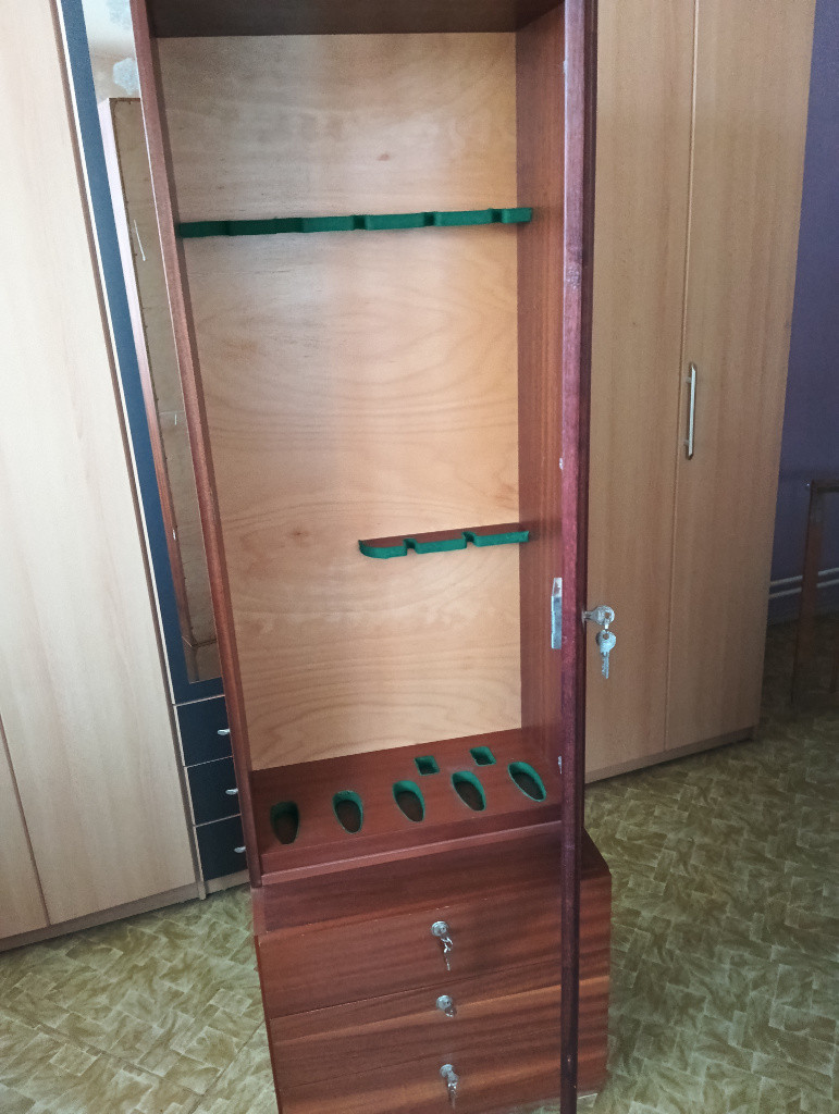 Nabízím tuto starší masivní vitrínu na zbraně Vitrína i zásuvky jsou všechny uzamykatelné + náhradní klíče. Jedná se o starší masivní výrobek ve velmi dobrém stavu vzhledově hezké bez otluků nebo škrábaců sklo je zdobené leptáním, vrchní část je oddělitelná.
