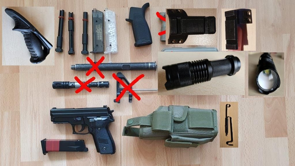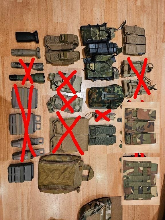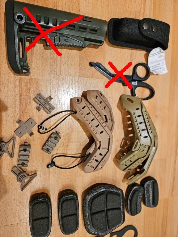 Prodám - Sig 228 of KJW a k němu 1 zásobník. Sig je ve velmi dobrém stavu a běhá jak má, zásobník bude pro vícedenní akce asi chtít přetěsnit. V ceně k němu Stehenní pouzdro - nemá popruhy kolem nohy a závěsný popruh, ale všechno je na sucháč tak není problém dát tam náhradní. Tři z plniček na fotce plus alice clip (AS) k němu zdarma.(prodáno) - Pažbička kopie BCM pro elektriku (150), přední ručky (100) -rail na malý kolim na montáž na puškohled(3D tisk) (50) - railové předpažbí M4 zn. LaRue, délka ca 25cm, FDE. Kvalitní věc, povrch není lakovaný, je to elox. (1100) - věci na hlavu : Ochranná maska s krytím uší černá, jen vyzkoušená, šel jsem do cellobličejvé masky (150) , - maskovací kukla s listím (100) - Věci na helmu viz foto: raily 150/pár, polštáře nové 50/sadu, kameny 100 za všechny, kšíry na helmu coyote nové(150) Sumky viz fotka - sumky nové jednoduché 90/ks, nové dvoj/trojité 180/ks - sumky použité jednoduché 50/ks, dvojité 90/ks - ručky použité 90/ks - IFAK 200 - taktický návlek na opasek Emerson, MC tropic.Na vnitřní straně sucháč - 200