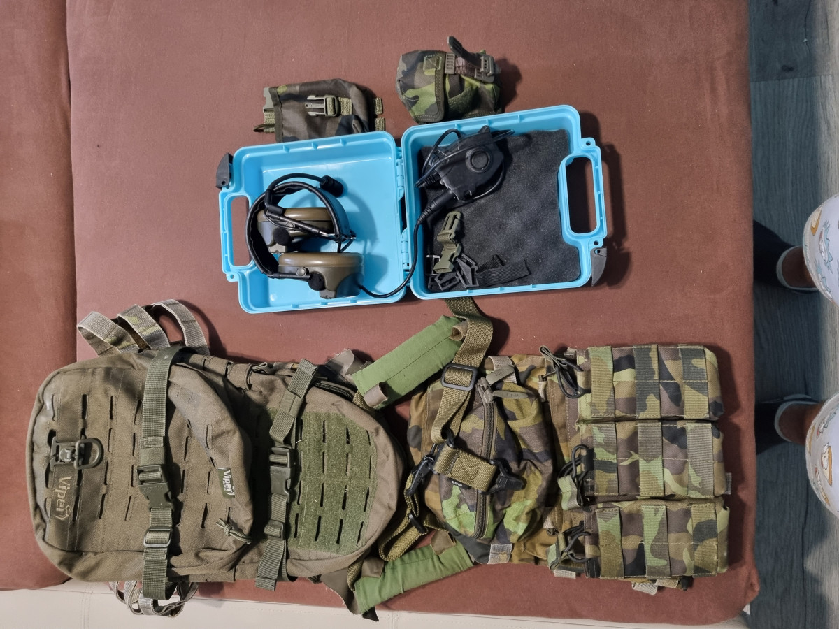 Zdravím Nabízím zde vestu osazenou 3sumkou na m4 zásobníky, viper batohem, a 1x uni sumka 2000,- ( včetně 2x sumka níž vypsaná) Dále ještě sumka na vysílačku a granatova sumka A v poslední řadě sluchátka k vysílačce 500,- sluchátka prodáno. Prosím o komunikaci přes SMS