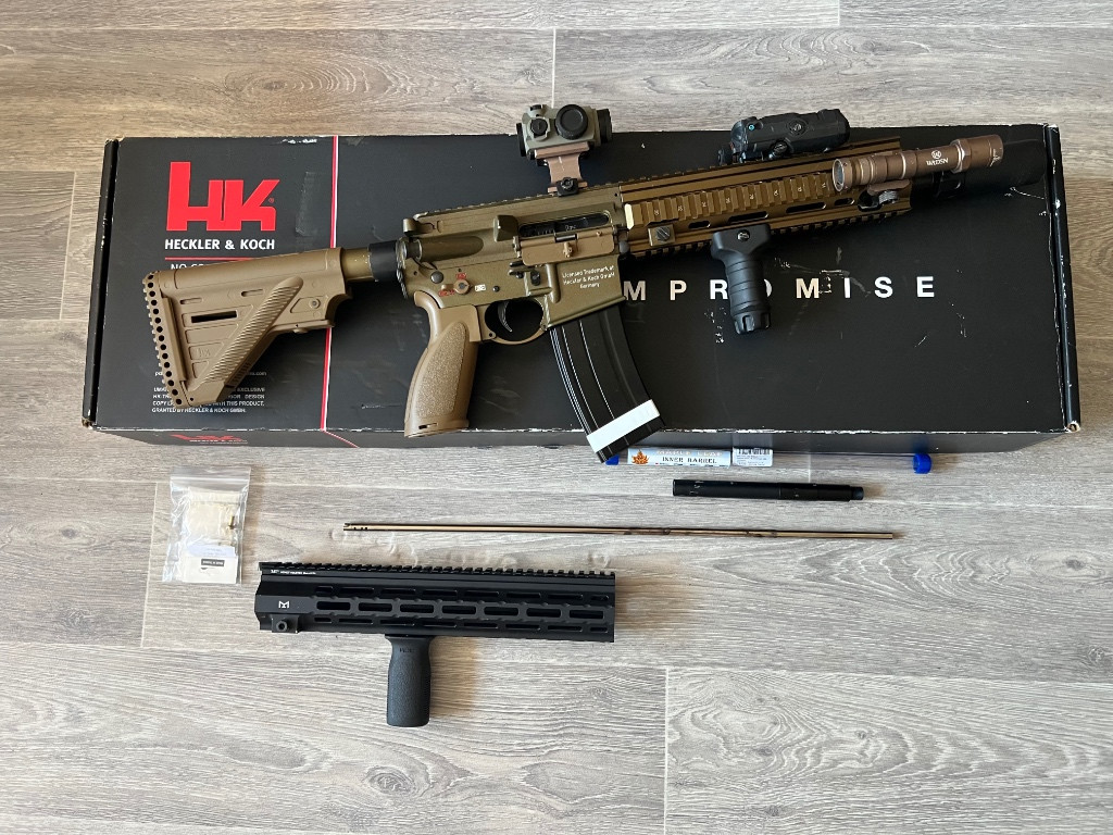 Dobrý den, prodám HK416 GBBR od VFC. Zbran plně funkční, lehké oděrky od používaní. Ke zbrani přidávám delší predpazbi, delší vnitřní hlaveň a prodloužení vnější hlavně. Ke zbrani dávám jeden funkční zásobník, ale lze přikoupit další z mého dalšího inzerátu. Zbraň prodávám bez příslušenství, ale mohu ho k tomu přihodit za nějakou lepší cenu. Takhle jak je na fotce bez prislusentvi, cena 11 tisic.