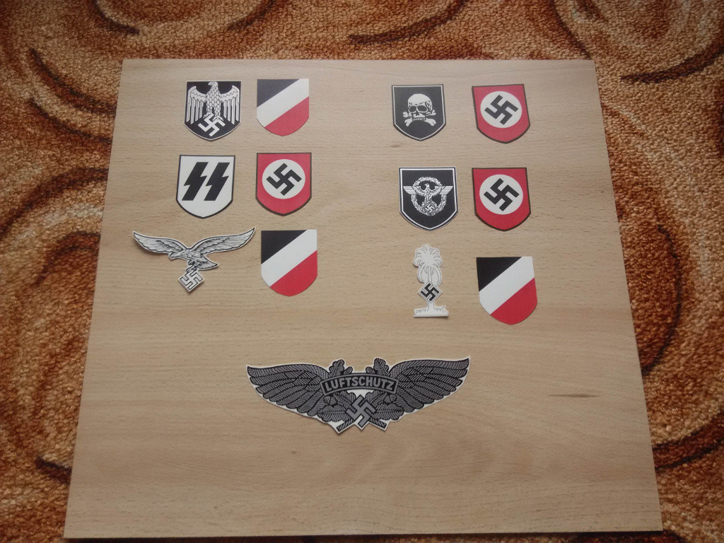 Prodám vodoznaky/obtisky na německé válečné helmy. Vodoznaky byly používané na helmách v období 2. světové války a to jednotkami: Waffen-SS, Wehrmacht, Luftwaffe, Afrikakorps, SS- Tot., Deutsche Polizie, Luftschutz. Velikostí, kvalitou a barevným provedením odpovídají vodoznakům používanými za války. Jedná se o repliku. V případě zájmu o jiný vodoznak napište. Použití: Stačí ponořit do vlažné vody, vodoznak se oddělí od podkladu a nanese se na helmu. Náklady na dopravu: Osobní odběr 0 Kč. Možná balikovna nebo zásilkovna. Předem 80kč, dobírka 120kč. Cena: 199Kč/pár „Nabídka mých předmětů je určena výhradně jen pro sběratelské účely.”