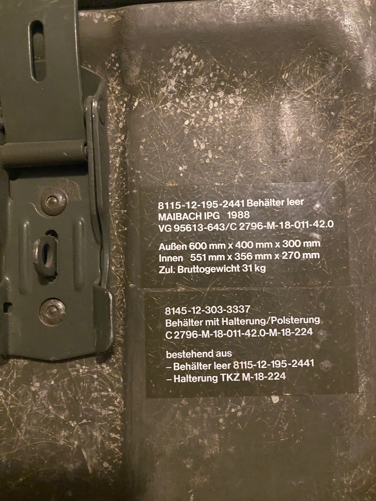 Prodám vojenskou bednu Materiál kompozit/sklolaminat Výrobce Maibach Je to z Německé armády Velikost 60x40x30cm Možnost odeslani Cena 2200,-