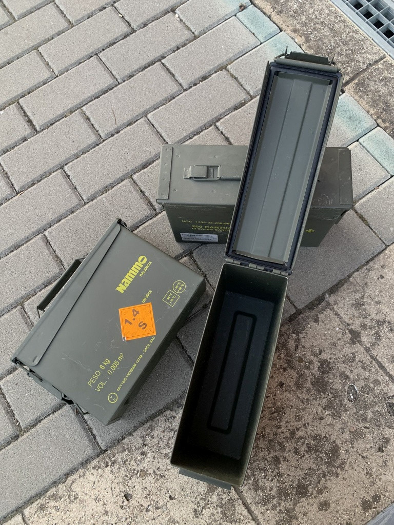 vojenské bedny M2A1 hermetické plechové. Původně určené na hermetické uskladnění střeliva. Vhodné zejména na střelivo nebo nářadí šrouby, baterky atd. Předání Břeclav. Materiál: železo - rozměry : 30 x 16 x 18 cm - Váha : 2.6 kg M2A1 350 kč Možno i menší velikost typ M19a1 za 350 kč a vetší bedna než M2a1 ta je za 450 Kč Možnost zaslat GSL až 12 ks naráz balík XL. Nebo 1-2-3-4 ks zásilkovnou.