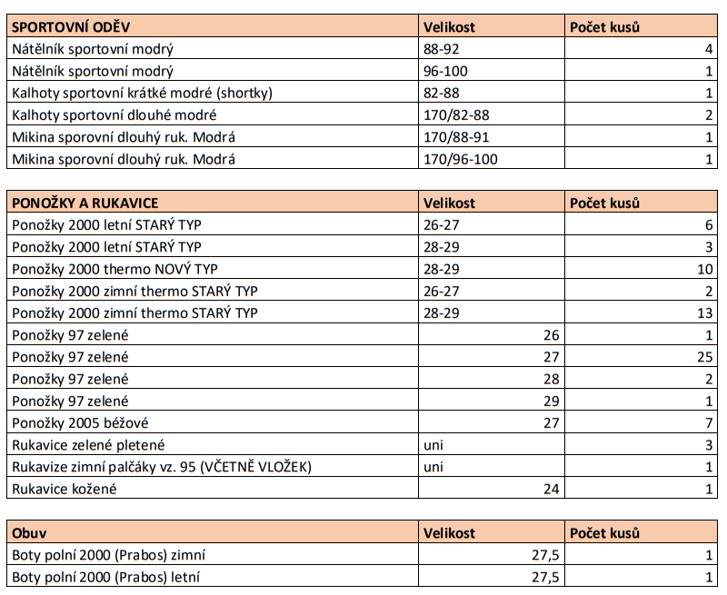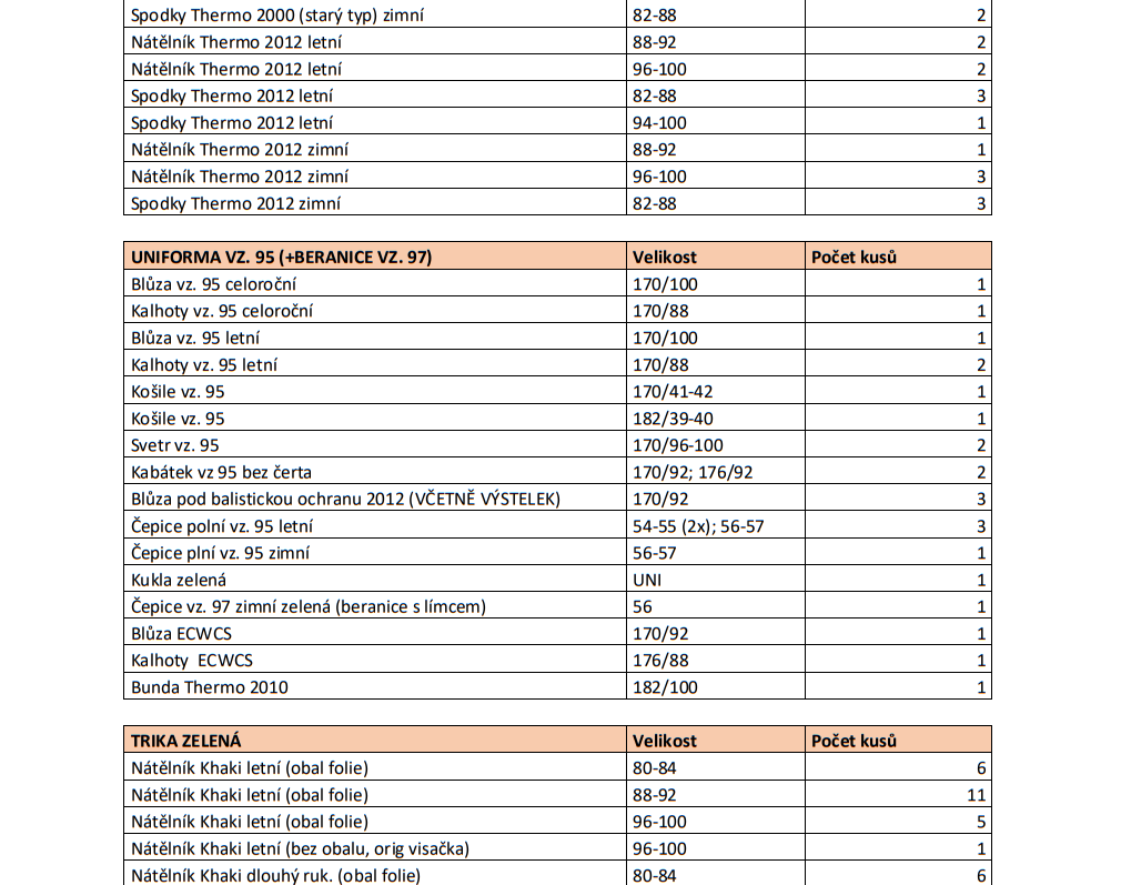 Dobrý den, velice rád bych Vám nabídl některé z výstrojních součástek armády ČR. Přílohou tohoto mailu je souhrn všech dostupných součástek včetně jejich počtů a velikostí.