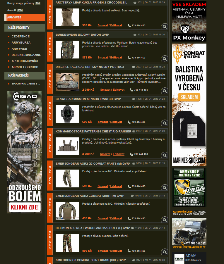VŠECHNY INZERÁTY JSOU DOSTUPNÉ DO SMAZÁNÍ. V PŘÍPADĚ ZÁJMU PIŠTE NA ČÍSLO. V NABÍDCE: Helikon Woodland // Emersongear AOR2 // Smilodon Multicam, Khaki // KOMMANDOSTORE Pattern 84 chest rig ranger green // UK Británie MTP nosný systém // CLAWGEAR mission sensor II ARC'TERYX kukla crocodile // BUNDESWEHR bojový batoh // AČR VZ95 blůza // UF PRO flecktarn //