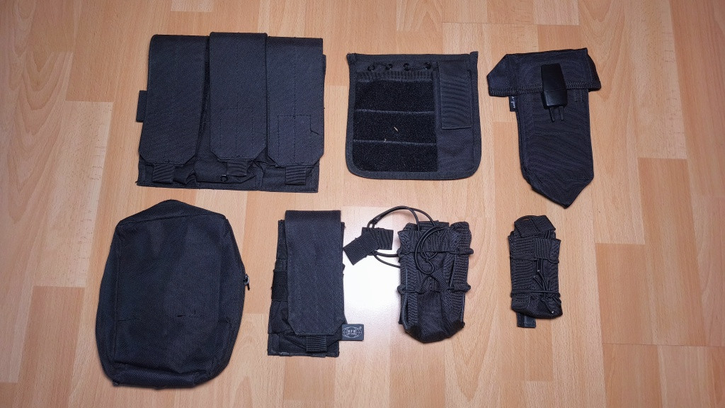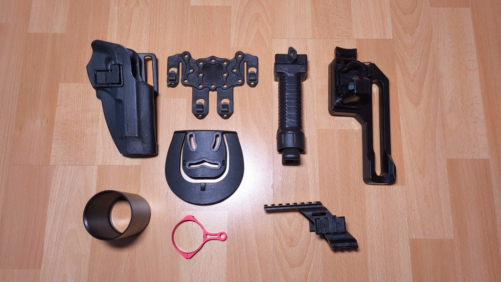 Trojitá sumka na AR zásobníky- 100 Kč, Admin sumka - 50 Kč, Sumka se sponou - 50 Kč, Univerzální sumka - 50 Kč, Uzavřená sumka na AR - 50 Kč, Dvojitá sumka upravená na GG lahve - 50 Kč, Otevřená sumka na pistolový zásobník - 50 Kč, Opasek černý - 100 Kč, Opasek zelený - 100 Kč, Kapsa na helmu MC - 100 Kč, Pouzdro na M92 se třemi montážemi - 150 Kč, Grip s dvojnožkou - 100 Kč, Novritsch QD holster pro MK23 - 750 Kč, Clona na 50mm puškohled - 50 Kč, Kroužek s pákou pro LPVO - 25 Kč, RIS montáž pro pistole - 50 Kč, Nabíječka NiMH baterií - 50 Kč.