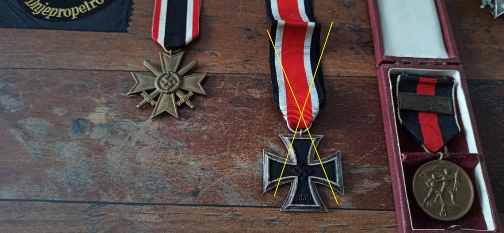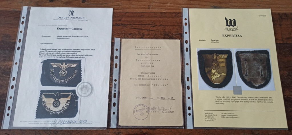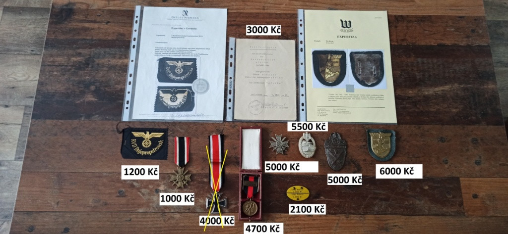 Prodám vzácné originální medaile odznaky a vyznamenání. Ceny jsou uvedeny níže. Ruším sbírku. Více fotek pošlu do emailu nebo whatsApp. Koukněte i na mé další inzeráty. Odešlu balíkovnou nebo zásilkovnou, cena dopravy 90 Kč. Není problém ani osobní předání. Na prodej: Rukávová páska Říšského strojvedoucího. RVD Dněpropetrovsk. Včetně expertízy pravosti. Cena 1200 Kč. Záslužný kříž 1. třídy s meči. Značeno 43. Výrobce Julius Bauer & Söhne Zella-Mehlis. Tombak. Cena 5000 Kč. Odznak pancéřových granátníků a tankových posádek ve stříbře. Značeno A.S. Výrobce Adolf Scholze Grȕnwald. Cena 5500 Kč. Rukávový štít Demjansk. Nález. Cena 5000 Kč. Identifikační známka Kriegsmarine. Top stav. Cena 2100 Kč. Rukávový štít Krim. Krásný kousek. Včetně expertízy pravosti. Cena 6000 Kč. Medaile v upomínku na 1. říjen 1938 se sponou “Pražský hrad” + etue. Značeno L/12. Výrobce C. E. Juncker, Berlin. Cena 4700 Kč. Záslužný kříž druhé třídy s meči. Cena 1000 Kč. Dekret k Rukávové pásce Afrika. Dekret je frontový, tedy prozatímní, napsán v poli v Africe v roce 1943. Dekret koupen od spoluautora knihy německých vyznamenání 1933 - 1945 a je přímo vyfocen v tomto katalogu. Top stav. Cena 3000 Kč.