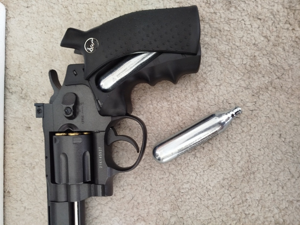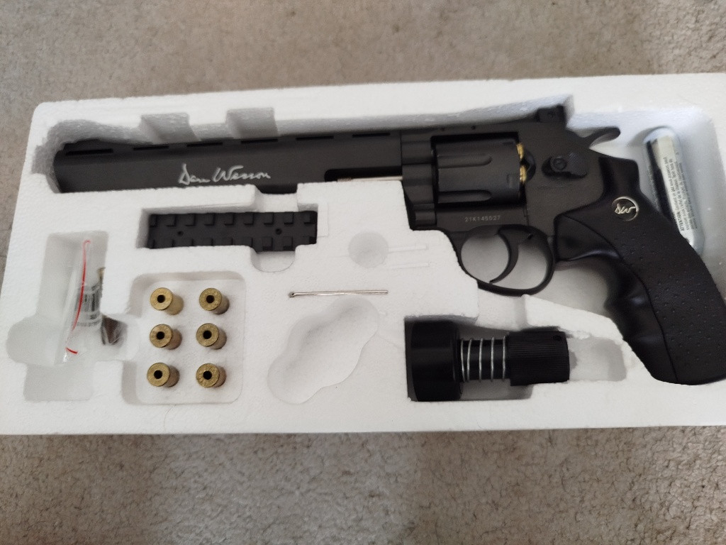 Prodám vzduchový revolver Dan Wesson 8 Cal.4.5mm bb broky,pohon jedna CO2 bombička. Revolver má hladkou hlaveň hodí se spíš na destruktivní střelbu lahve,plechovky.Neni vhodný na airsoft Top stav Součástí balení 13 nábojnic,dvě CO2 bombičky,zbytek broků,RIS. Lišta,rychlonabíječ,originální balení