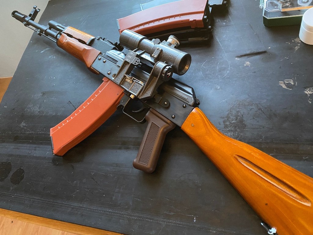 Prodám toto ak bylo už na pár akcích ale nenese známky používání. Je plně funkční a dává s greengas cca 1,7 J s 0,32 bbs. Vložil jsem do něj pár upgrade dílů: Poseidon hlaveň Air Cushion 6,05mm MeapleLeaf HopUp gumička MR Hop 70° Podložka pro krátký chod závěru Dále k němu přidám RaTech díly a 3 zásobníky navíc. Kolimátor na fotce po domluvě mohu přidat také.