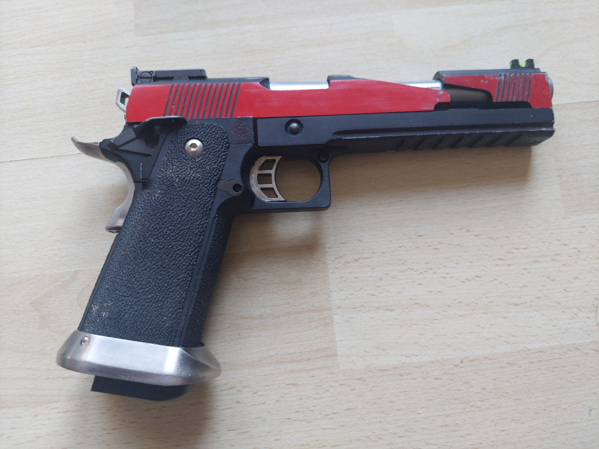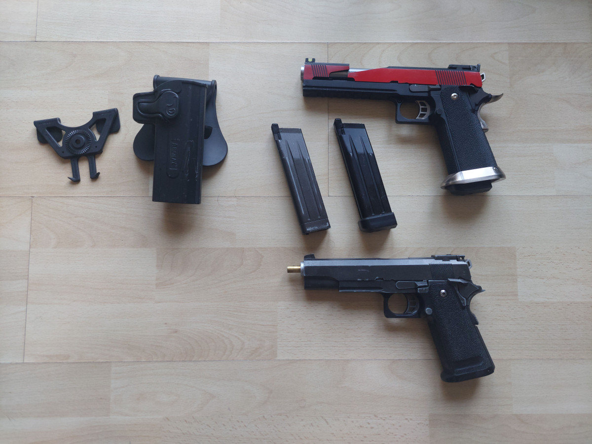 Prodám Hicapu od WE, nevyužívám záložky, nese běžné známky opotřebení (spíš vytahování a zandávání do holsteru). Je vyčištěná a promazaná. K pistoli 3 zásobníky (jeden bez patky), všechny by měly těsnit, amomax pouzdro s molle adaptérem. V pistoli gumka a hlaveň maple leaf. Druhá (šedá) hicapa jenom fluše, je v ní origo hlaveň z té červené, nechávám k tomu na díly nebo na opravu. PC hicapy 3550, se vším kolem bych si představoval něco kolem tohohle čísla.