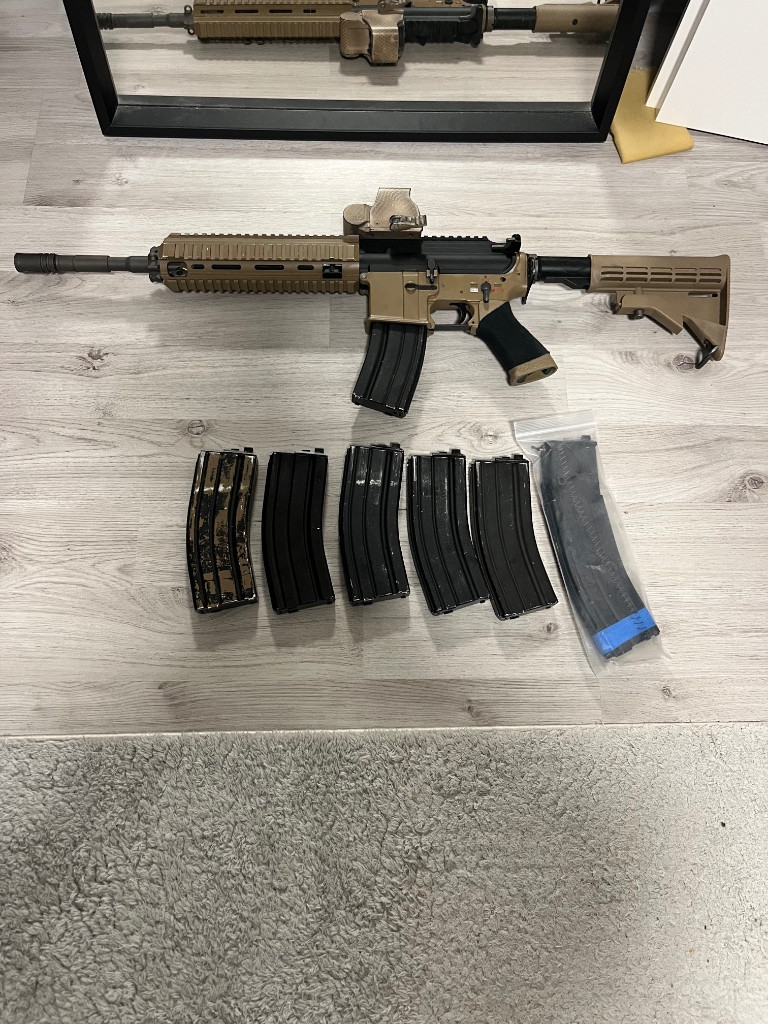 Ahoj, Prodám airsoftovou zbraň od WE 416. Ke zbrani 6 zásobníku, všechny přetěsněné a plně funkční. 7.zásobník je komplet, sle rozebraný, nemám čas dát do kupy. Ke zbrani je kolimátor typu Eotech, mohu po domluvě přidat i tlumič. Hodně jezdím, takže je možnost předat kdekoli Pardubický nebo Královehradecký kraj. Není problém ani ve Středočeském - Poděbrady, Nymburk.