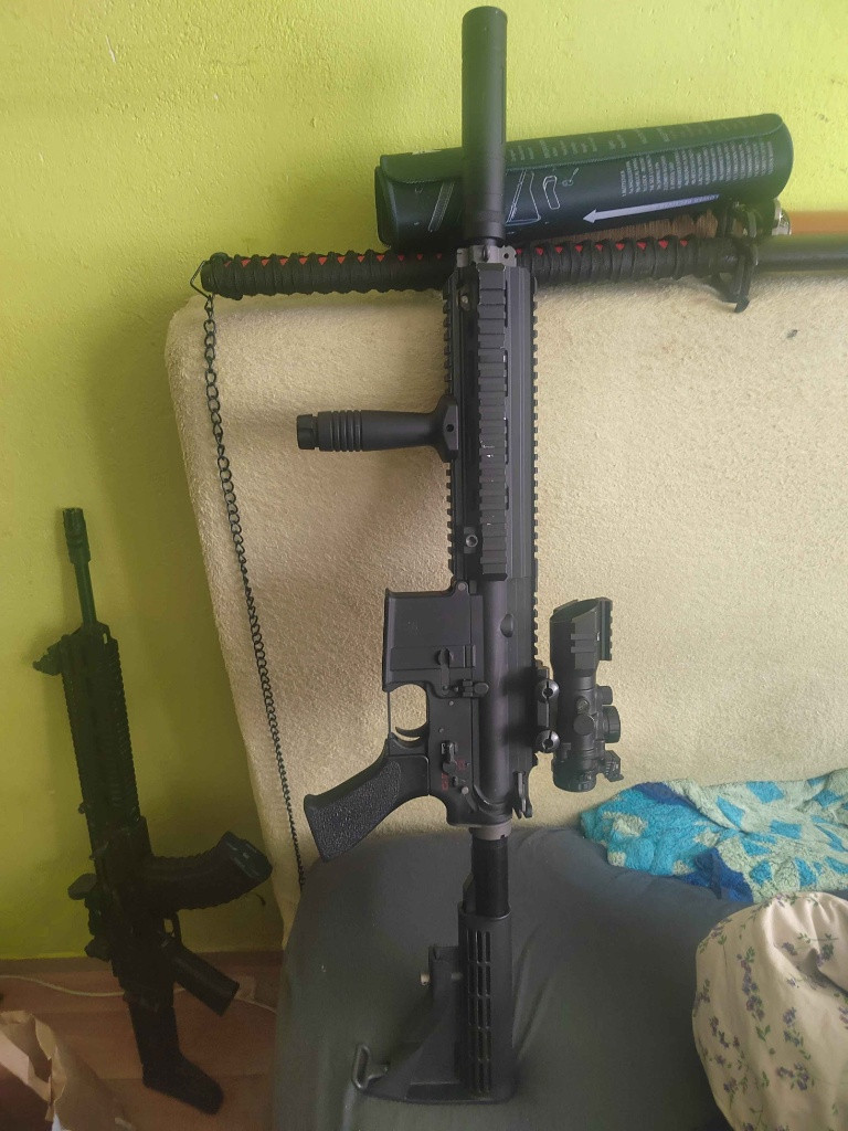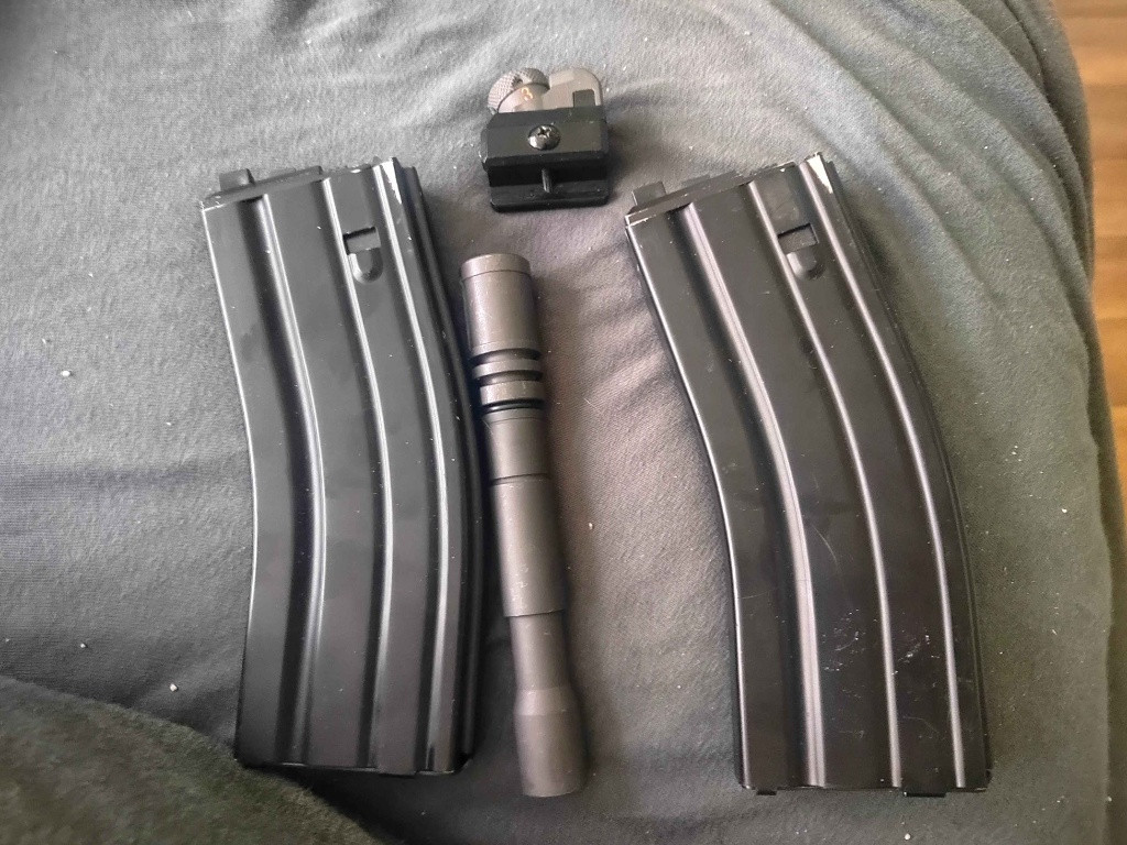 Oba zásobníky těsní, vše je originální až na kolík který drží upper (původní WE vypadával) stříleno párkrát, hráno ne. Cena je bez příslušenství (kromě originálního což je hlaveň s flash hiderem a přední a zadní mířidlo). Na fotce není přední mířidlo protože jsem líný prase, ale mám ho :D až najdu při úklidu tak dofotím. Nabídkám na výměnu se taky nebráním.