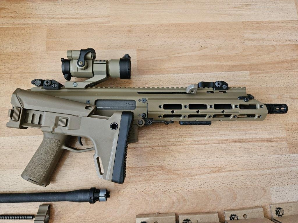 Prodám WE Masada GBB v barvě FDE. Osazená kratší hlavní na CQB. K ní 5 skoro nových zásobníků. Mechanická mířidla, původní hlaveň (vnější i vnitřní s hop komorou). Spousta ND (gumičky, housing spoušťáku, závěr (není nový), gumičky, těsnění, pův. flash hider... Asi nejhezčí flinta ale už dlouho nehraju a začíná to doma překážet. Takže prosím nenabízet výměnu. Kolimátor NENÍ součástí prodeje (resp. po dohodě).