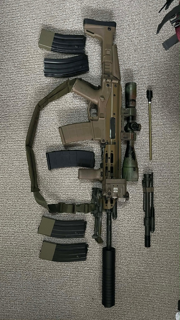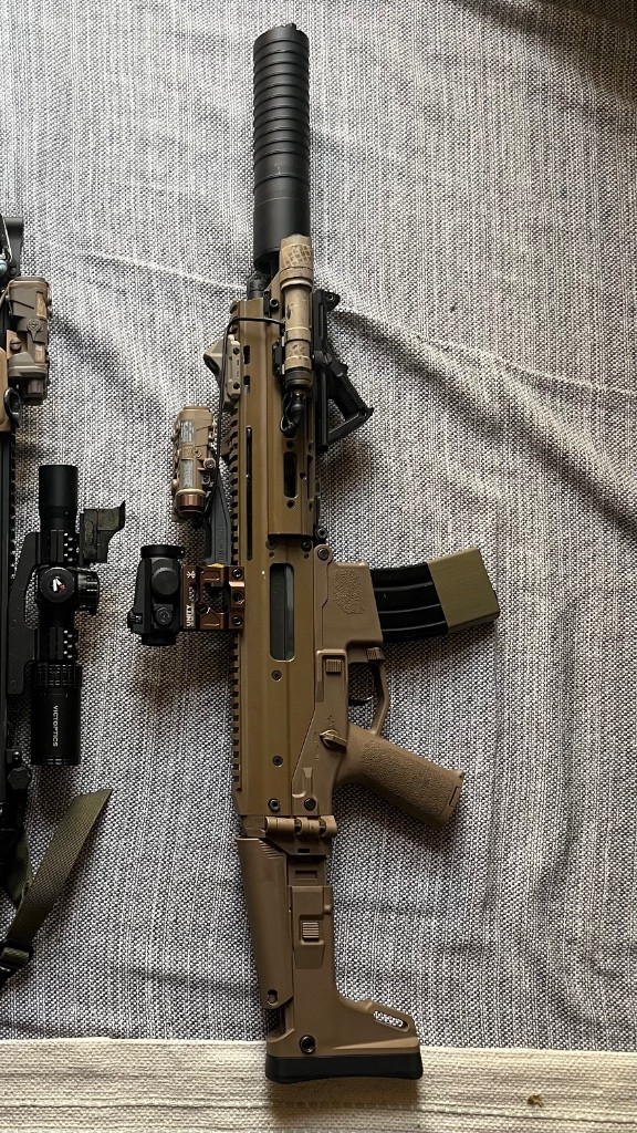 Zdravím, prodám svou plynovou masadu. Ve zbrani tryska s NPASem, nové díly ve spoušťáku, nový záchyt závěru, hop up gumičky maple leaf, hlaveň už si nepamatuju ale myslím že to byl prometheus. Ke zbrani přidám optiku theta 4-16x50, dvojnožku, tlumič, vertikální rukojeť, dbal. Druhý kompletní set krátké hlavně. 5+1 zásobník, a pár náhradních dílů. Možnost přiložit za příplatek i kolimátor maverick s vysokou unity styl montáží s lištou na peq a svítilnu, pro dostavení krátkého buildu.