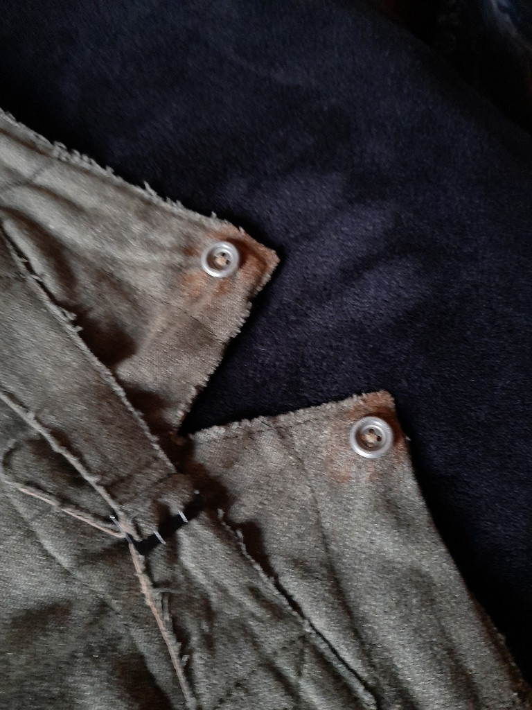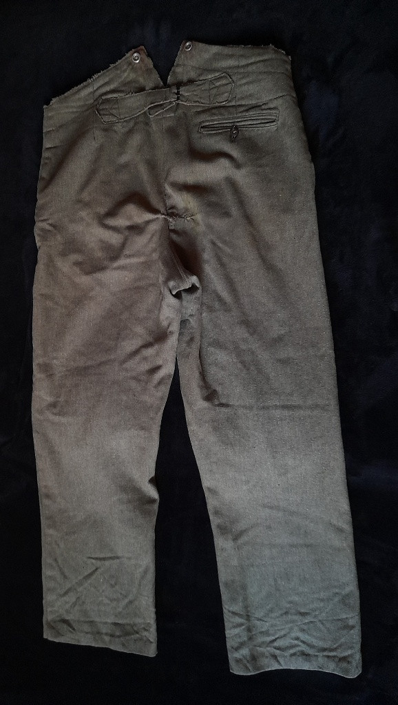 Prodám vlněné kalhoty M40 pro WH/SS. Jedná se o repliku z produkce ZIB Militaria, jsou už dost nošené, ale stále použitelné, mají pěknou patinu. Na zadku jsou zašívané a mají malou dírku na pravém koleni. Tmavé fleky kolem knoflíků jsou od kožených průvleků z kšand. Velikost odpovídá M/50 - pas 90cm, délka kalhot 105cm. Cenu bych viděl tak 700,- + zásilkovna.