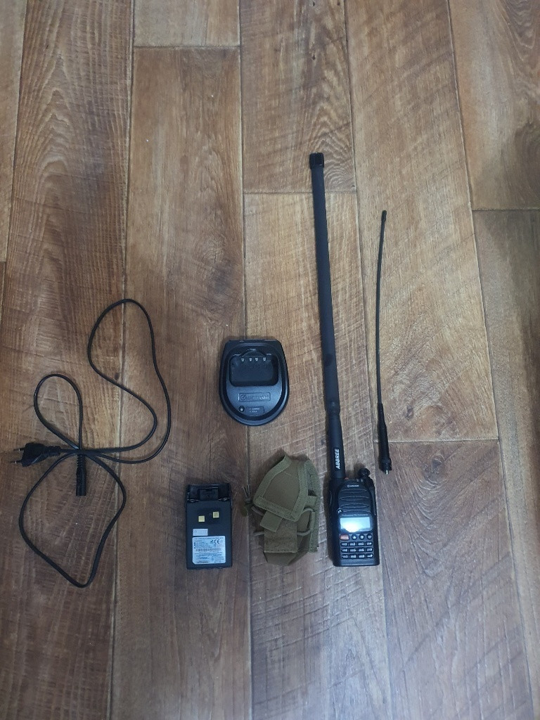 Tak jak je na fotce, vysílačka, 2x anténa ( zlamovací nefunguje ), 2x baterie, sumka, nabíječka. Použitá málo. Sloužila jen jako záloha.