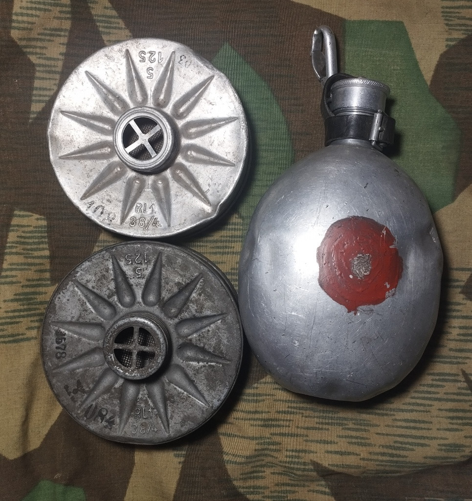 WW2 wehrmacht polní láhev a dva filtry k plynové masce