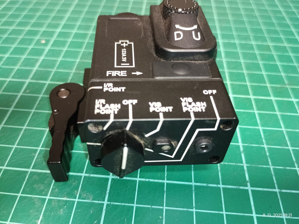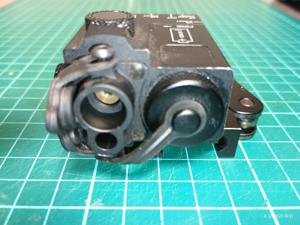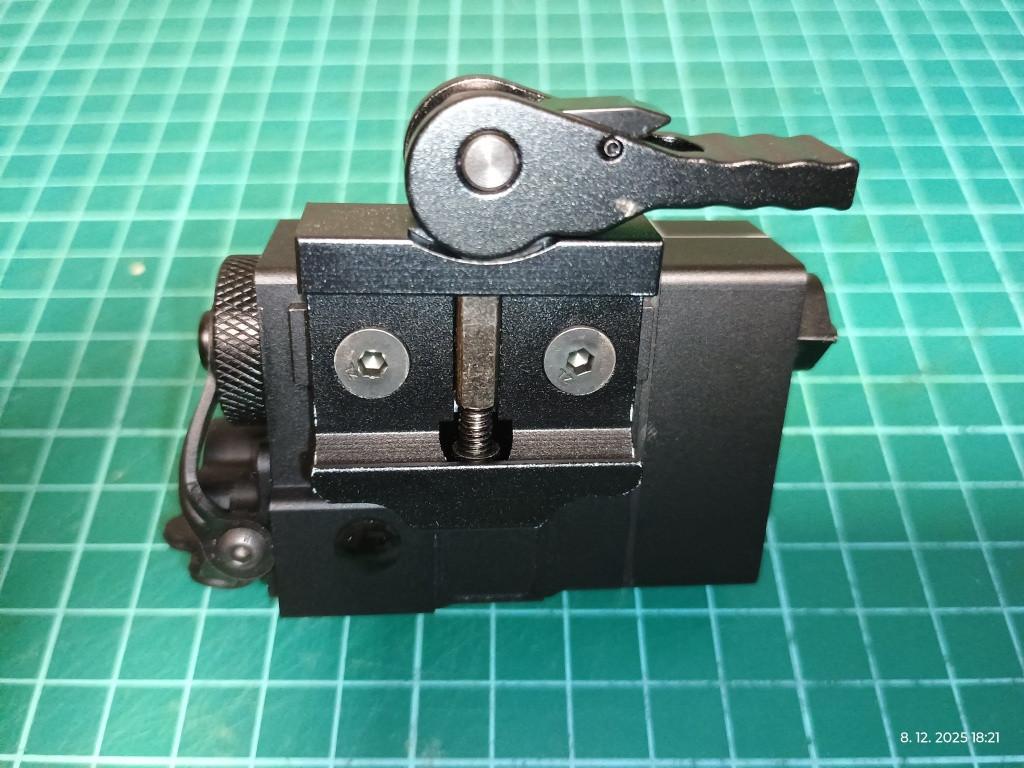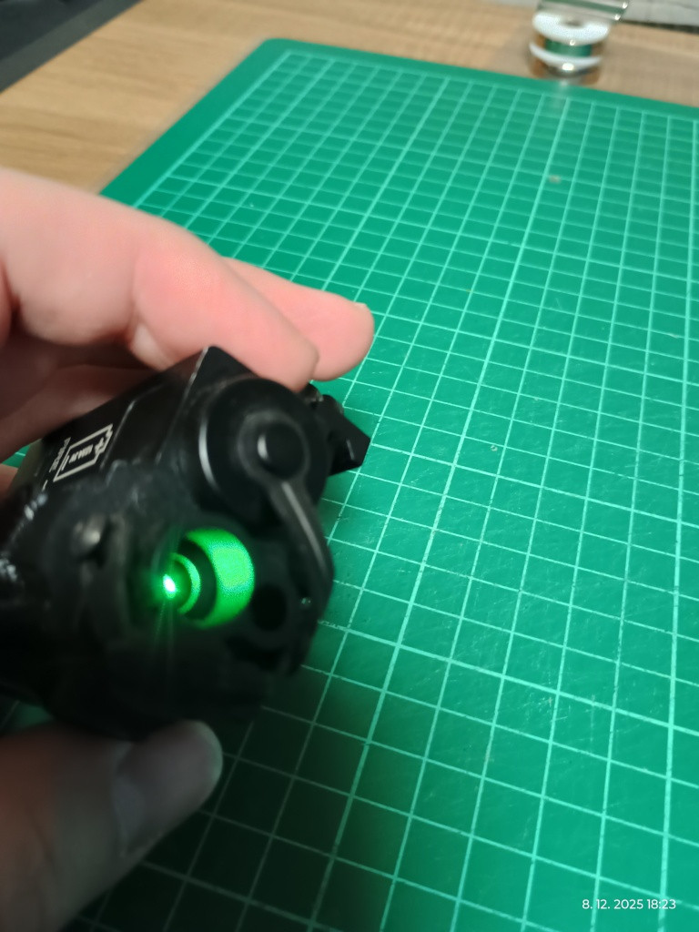 Zlený a IR laser, seřiditelný, kovové provedení, QD montáž. Napájení 1x CR123