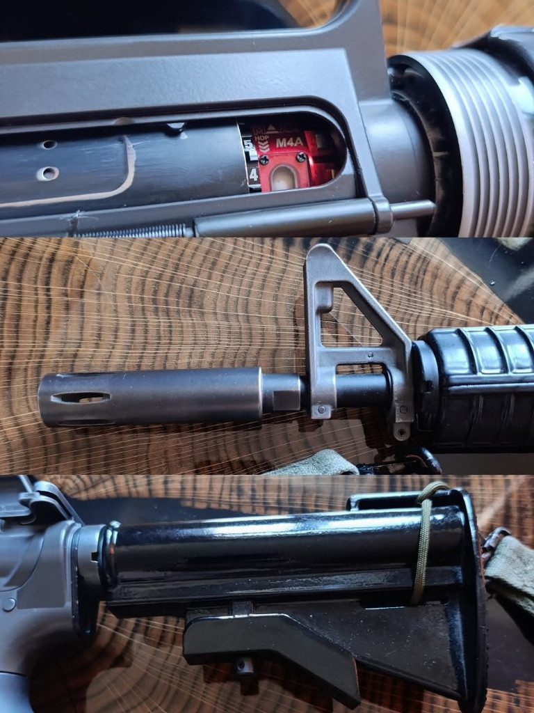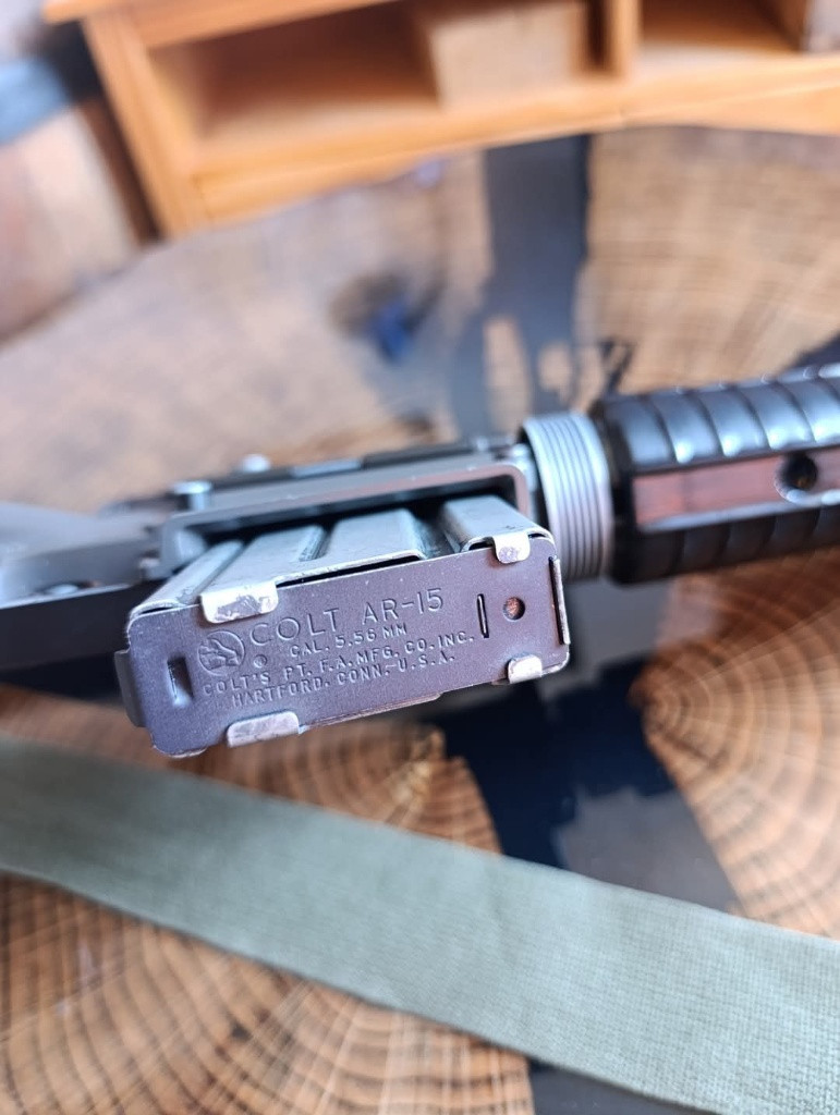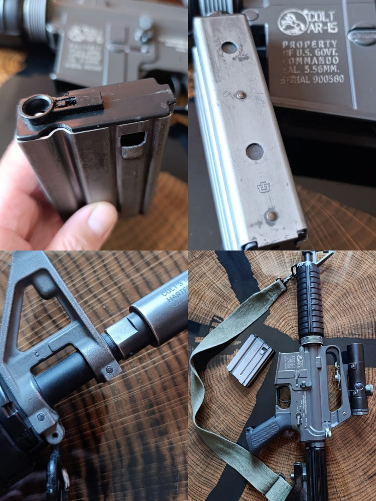 Prodám Cyma XM177E1 -Mosfet se zvukovou signalizací. -Hlaveň KM head...vystřeleno jen cca 40 kuliček. -Komora Maxx Pro, guma... myslím že jsem dával Maple leaf. -Baterie, nabíječka. -Přední mířidlo ocelové SRC. -Natahovací páka SRC. -Originální popruh. -Gravírování laserem podle reálné předlohy. -Tlačný zásobník je vložen do originálního krátkého. -Optika 4 x 20 na ní jsem udělal logo dobové COLT 3 x 20. -Předpažbí tenké (made in Israel) lakované polyuretanem, spodní díl vybroušen (a kus vnější hlavně) aby se vešla klasická baterie. -Pažba lakovaná polyuretanem, schválně štětcem. -Pažbička trochu vyleštěná Snažil jsem se aby to vypadalo co nejvíce realisticky. Byl jsem s tím pouze 3x, takže vše šlape jak má. Myslím že to má rychlo výměnu pružiny. Cena pevná, dokud to zde vidíte, je stále na prodej.