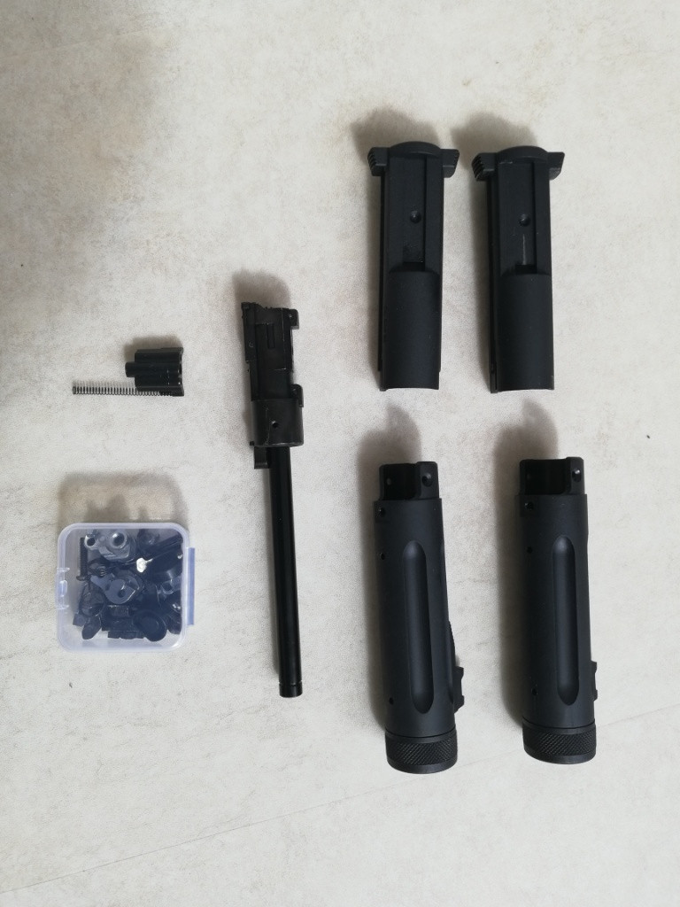 Prodám sadu základních dílů na AAP. součástí je 2x holý závěr, 2x vnější hlaveň, 1x vnitřní hlaveň s hop komorou, 1x nozzle block s pružinou a krabička s 2x základním spoušťovým mechanismem. Jedno kladívko má uražený čep, lze jej však nahradit rollerem / ložiskem z glocku a funguje dál. Všehny ostatní díly jsou zcela v pořádku.