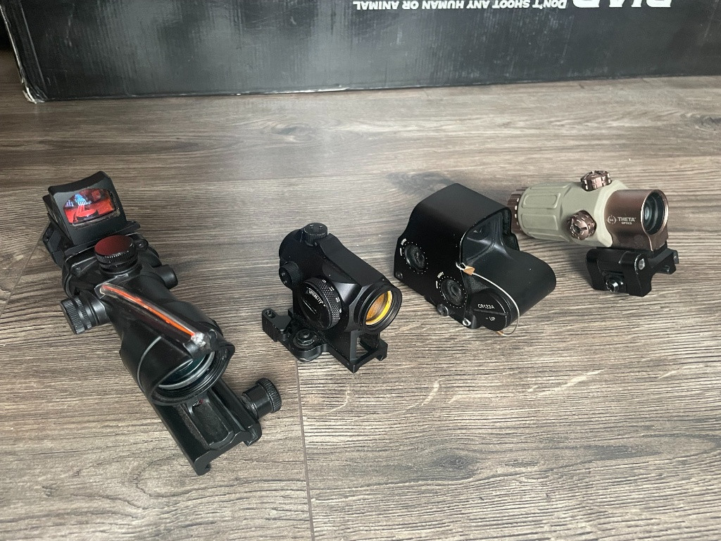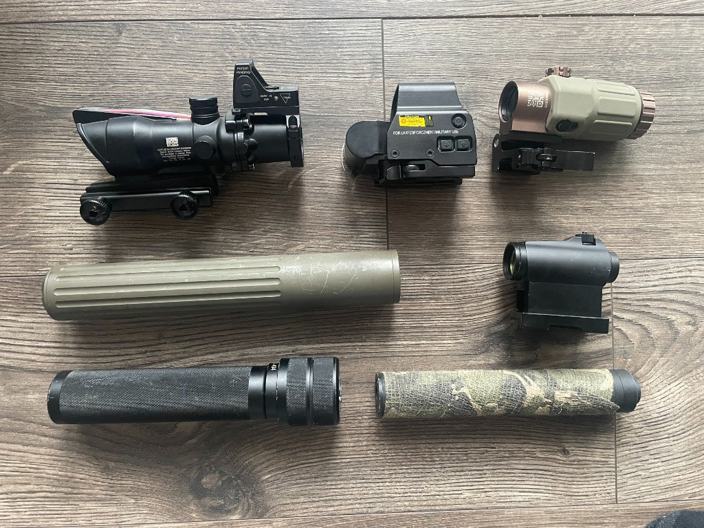 Dobrý den, příslušenství pro airsoftové zbraně. ACOG 4X32 světlovodné vlákno + mini dot+ killflash 2700,- Eotech + 3x přiblízení 2300,- Kolimátor s vysokou montáží -1200,- Tlumiče-zelený 600,- ak tlumič 800,- klasika 300,-