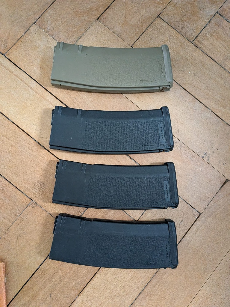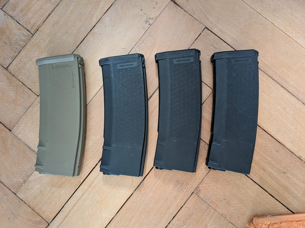 Čau Prodám zásobníky od specna arms. Tři tlačaky jeden točák. Všechny fungují bez problému hrané asi pětkrát, (některé jsou trochu škrablé). 150kč za jeden dohromady 600kč. Preferuju prodat všechny najednou.