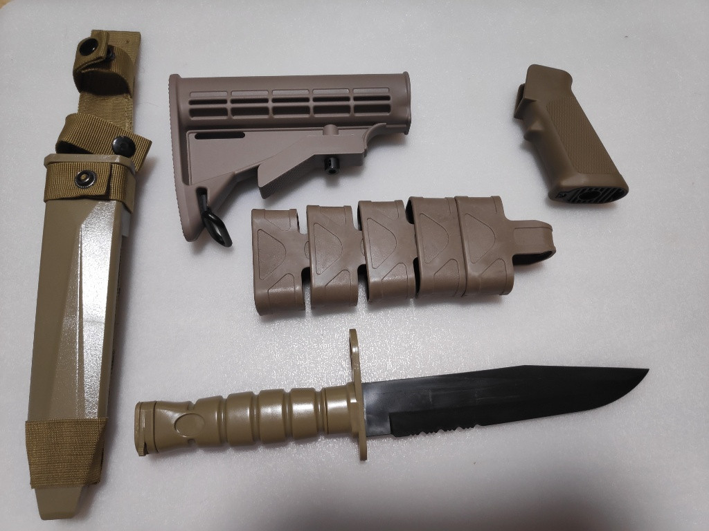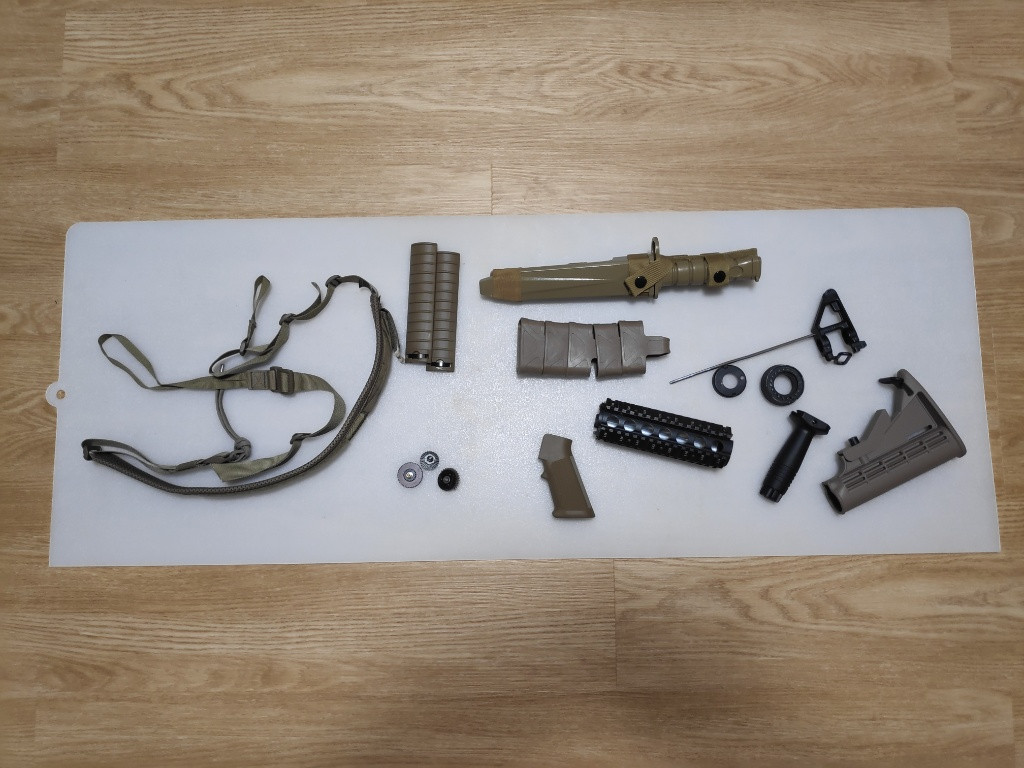 Dobrý den, mám na prodej zbytky z přestavby gunu. Chtěl bych to prodat jako sety nebo všechno dohromady ideálně. Set1: všechno nové věci v pískové barvě, pažba, pažbička, gumové vytahováky zásobníků, ris lišty, popruh, gumový nůž - 550,-. Set2: přední mířidlo, RIS předpažbí, delta ring, víčko, ručka - 600,-. Set3: Shooter CNC kola 100:200 - 200,- bez poškození. Při odběru všech položek najednou dám cenu 1200,- a poštovné zdarma nebo aspoň při odběru dvou setů, dám též poštovné zdarma.