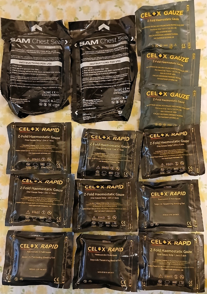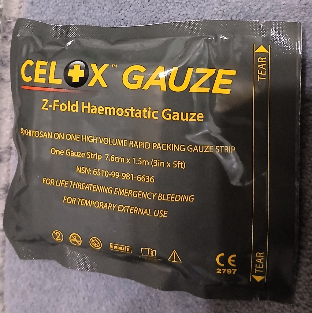 - Hemostatická gáza Celox Z-Fold, zdravotnický prostředek určený k rychlé zástavě život ohrožujícího krvácení. Obsahuje 8g chitosanu na jedné gázové pásce. Rozměr pásky je 7,6 cm x 1,5 m. Je určena pro dočasné vnější použití při silném krvácení. Funguje nezávisle na normálním srážení krve a vytváří adhezivní gel k utěsnění rány. Celox Rapid Gauze / gáza na rychlé zastavení krvácení Celox gázu, která obsahuje speciální hemostatické částice, jenž rychle a účinně zastavují krvácení. Tento inovativní materiál pracuje tím, že urychluje srážení krve na místě zranění, což je zásadní pro rychlou stabilizaci pacienta. Gáza je snadno aplikovatelná, což z ní činí ideální volbu pro první pomocníky i profesionály v oblasti zdravotní péče. Celox gáza je sterilní a hypoalergenní, což minimalizuje riziko infekce a nepříznivých reakcí. Je vhodná pro použití na různých částech těla a lze ji snadno přizpůsobit různým typům zranění. Je to spolehlivý nástroj pro záchranu životů v situacích, kdy rychlá lékařská péče není okamžitě dostupná. - Hemostatická gáza Celox Z-Fold. Zdravotnický prostředek určený k rychlé zástavě život ohrožujícího krvácení. Gáza je napuštěna 8 g chitosanu, přírodního polymeru získávaného ze schránek krevet, který urychluje srážení krve nezávisle na přirozeném koagulačním systému těla. Je navržena pro rychlou aplikaci do rány pomocí Z-fold balení. Účinně zastavuje silné arteriální krvácení, a to i u pacientů užívajících antikoagulancia (léky na ředění krve). Používá se pro dočasné vnější použití v případech traumatického krvácení, jako jsou hluboké řezné rány nebo střelné rány. Rozměry jednoho pásku gázy jsou 7,6 cm x 1,5 m. Při nákupu všeho daruji vše co je na poslední fotce. (nůžky, pean, pinzeta) 3x Celox Rapid (tmavý) Datum spotřeby: 2022/9 (200,- kč/ks) 5x Celox Rapid (tmavý) Datum spotřeby: 2027/12 (700,- kč/ks) 3x Celox Gauze (zelená) Datum spotřeby: 2027/5 (700,- kč/ks) wwww.Balikovna.cz
