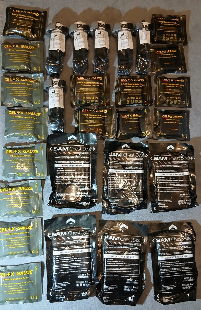- Tourniquet/ škrtidlo CAT generace 7, nové škrtidlo CAT sedmé generace. Má snadné použití a velmi funkční pro kontrolu toku krve ať už při poranění tak v kritických situacích v boji. Turniket lze aplikovat i jednou rukou. 700,-kč - Hemostatická gáza Celox Z-Fold, zdravotnický prostředek určený k rychlé zástavě život ohrožujícího krvácení. Obsahuje 8g chitosanu na jedné gázové pásce. Rozměr pásky je 7,6 cm x 1,5 m. Je určena pro dočasné vnější použití při silném krvácení. Funguje nezávisle na normálním srážení krve a vytváří adhezivní gel k utěsnění rány. Celox Rapid Gauze / gáza na rychlé zastavení krvácení Celox gázu, která obsahuje speciální hemostatické částice, jenž rychle a účinně zastavují krvácení. Tento inovativní materiál pracuje tím, že urychluje srážení krve na místě zranění, což je zásadní pro rychlou stabilizaci pacienta. Gáza je snadno aplikovatelná, což z ní činí ideální volbu pro první pomocníky i profesionály v oblasti zdravotní péče. Celox gáza je sterilní a hypoalergenní, což minimalizuje riziko infekce a nepříznivých reakcí. Je vhodná pro použití na různých částech těla a lze ji snadno přizpůsobit různým typům zranění. Je to spolehlivý nástroj pro záchranu životů v situacích, kdy rychlá lékařská péče není okamžitě dostupná. 700,-kč - SAM Chest Seal Combo, což je kombinované hrudní krytí určené k ošetření otevřených ran hrudníku v nouzových situacích. Skládá se z jednoho adhezivního krytí s chlopní (vented) a jednoho okluzivního (geclusiv) krytí bez chlopně. Zde jsou klíčové informace o produktu: Určeno pro ošetření život ohrožujících otevřených poranění hrudníku, která by mohla vést k tenznímu pneumotoraxu. Designováno pro silnou přilnavost i v extrémních podmínkách, jako je přítomnost potu, krve, ochlupení nebo vody. Obsahuje jednocestnou chlopeň (ventil), která umožňuje únik vzduchu z hrudní dutiny, ale brání jeho nasávání zpět. Jednoduché a rychlé použití dle přiloženého návodu na obalu. 700,-kč - Hemostatická gáza Celox Z-Fold. Zdravotnický prostředek určený k rychlé zástavě život ohrožujícího krvácení. Gáza je napuštěna 8 g chitosanu, přírodního polymeru získávaného ze schránek krevet, který urychluje srážení krve nezávisle na přirozeném koagulačním systému těla. Je navržena pro rychlou aplikaci do rány pomocí Z-fold balení. Účinně zastavuje silné arteriální krvácení, a to i u pacientů užívajících antikoagulancia (léky na ředění krve). Používá se pro dočasné vnější použití v případech traumatického krvácení, jako jsou hluboké řezné rány nebo střelné rány. Rozměry jednoho pásku gázy jsou 7,6 cm x 1,5 m. 700,-kč Cena za kus www. Balíkovna.cz zdarma Při nákupu všeho daruji vše co je na poslední fotce. (nůžky, pean, pinzeta)