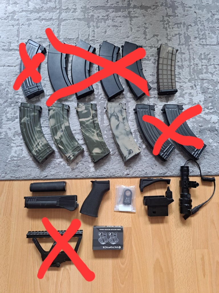 Zasobníky: 2x plechový zásobník E&L (7,62), 2x plastový zásobník E&L (5,45), 1x cyma Spolu 450kč Predpažbie AK74mn - 125kč Pistol grip AK - 125kč Oko na popruh zenitco A-1 - 175kč Horizontálny grip na Mlock - 75kč Adapter na velkokapacitnú plničku pre a AK zasobniky - 125kč Baterka s montážou a tlakovým spínačom - 250kč Montážne krúžky - 100kč +421918925709