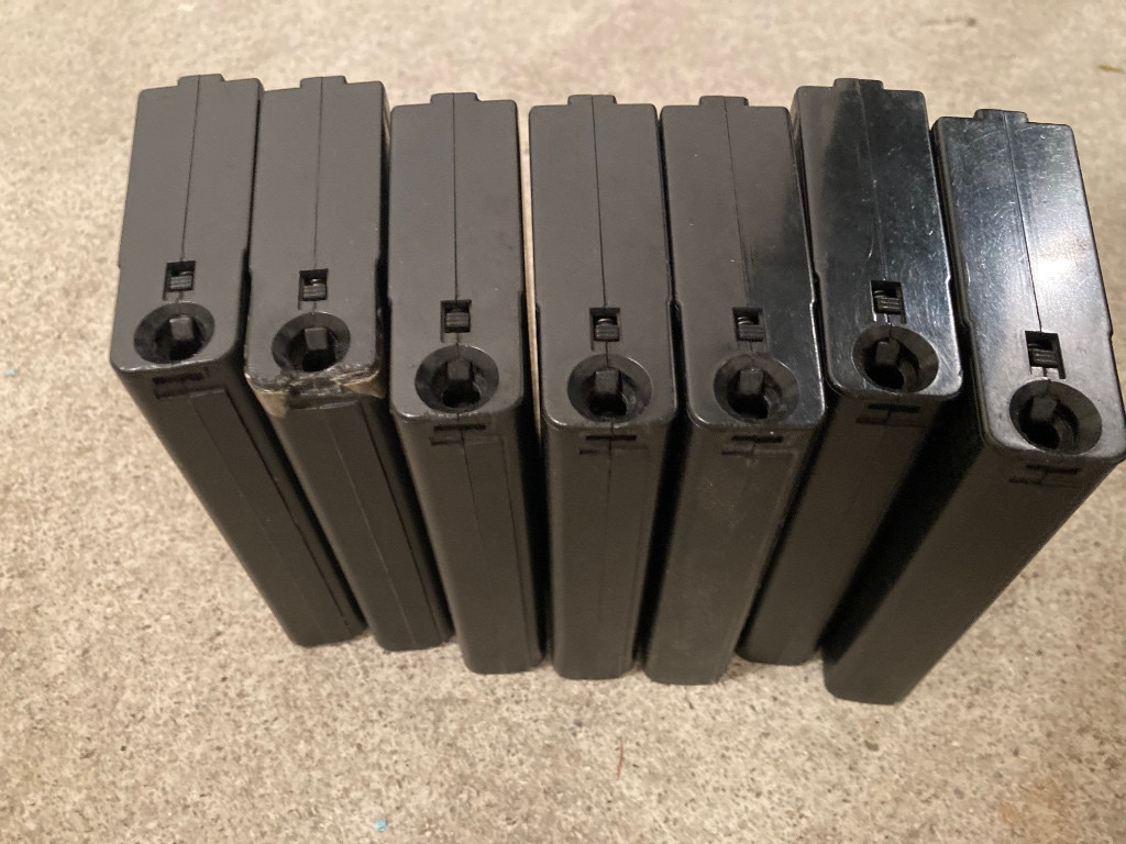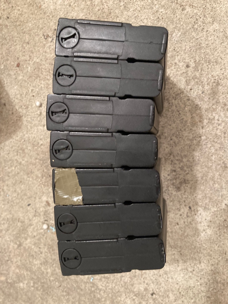 prodam tlacaky do m14. delsi dobu nepouzivane, skladovane bez kulicek, pruziny funguji a pri odjisteni zasobniku vytahnou vsechny kule. plastovy, kapacita cca 110 ran, 7x. jeden plastovy zasobnik ma ulomeny plast u hrdla zasobniku, viz foto, na plneni to nema vliv. ve zbrani sem nezkousel, dalsi ma ducttapou pojisteny sroub pro vyjmuti pruziny. cena 100kc/ks.